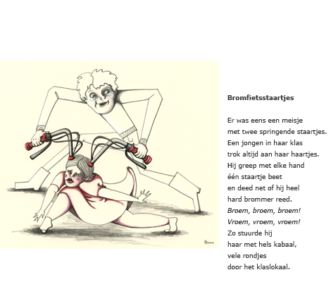 Hij pakt een liniaal en snijdt vijf messen,wanneer ze in de verte een kruk horen flessen. |
